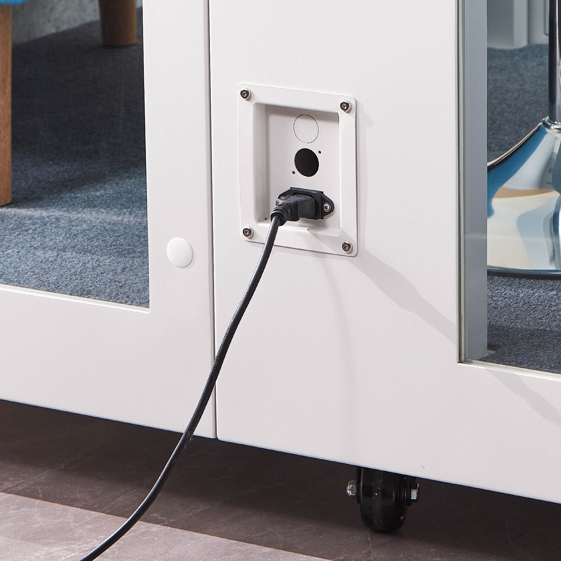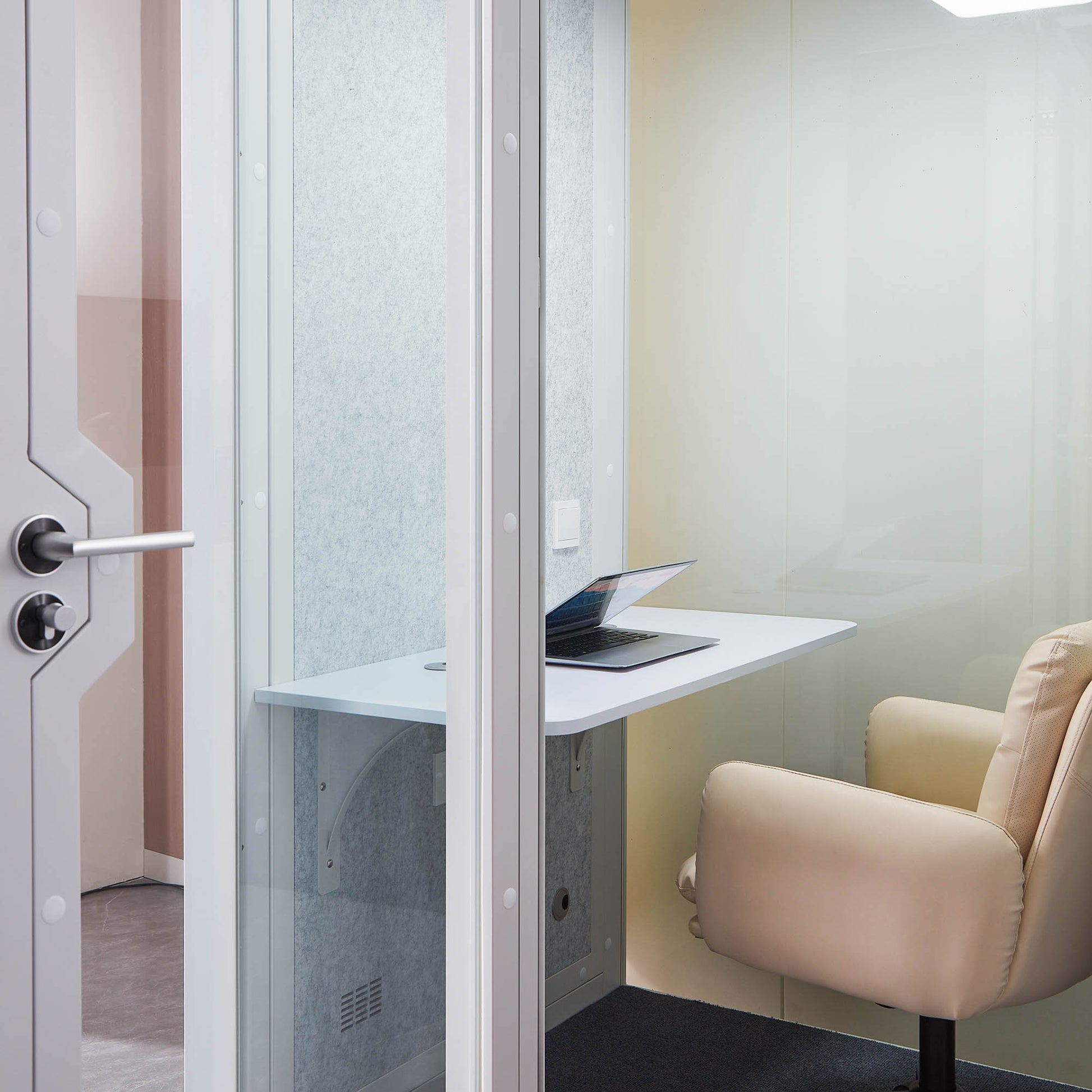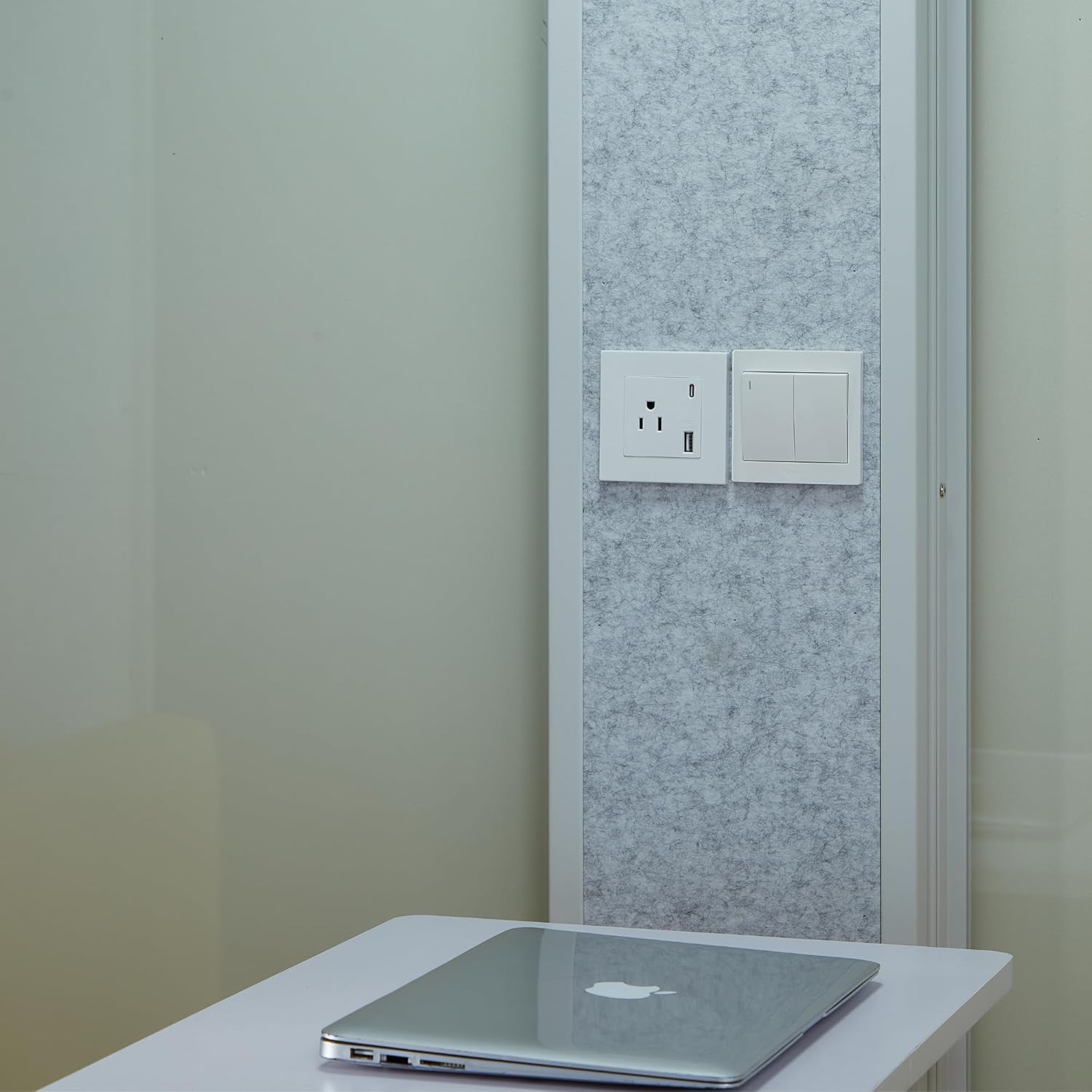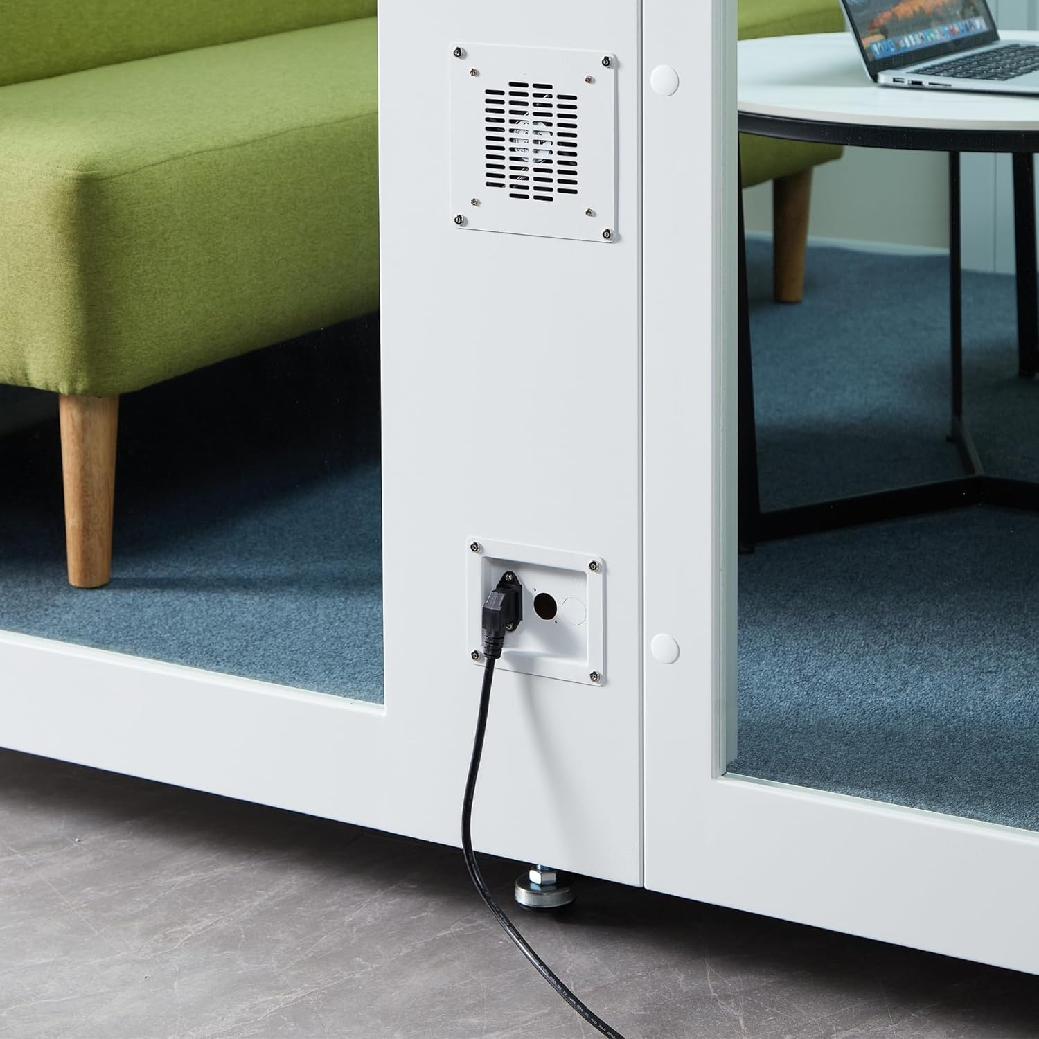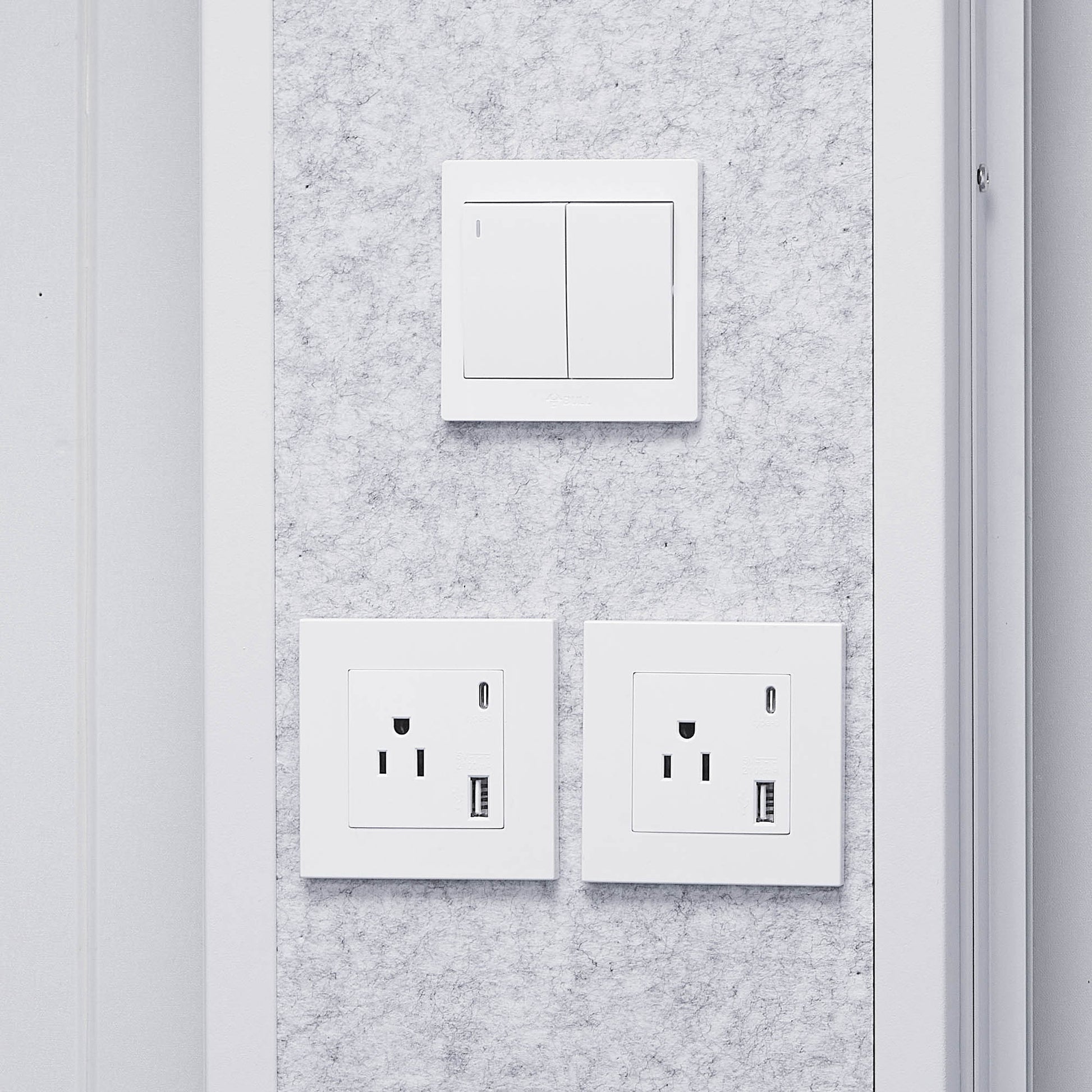 SGS-certified Class-A acoustic rating for distraction-free focus. Dual fan ventilation maintains comfort with minimal noise. Integrated AC power, USB-A and USB-C ports with natural LED lighting support continuous work.